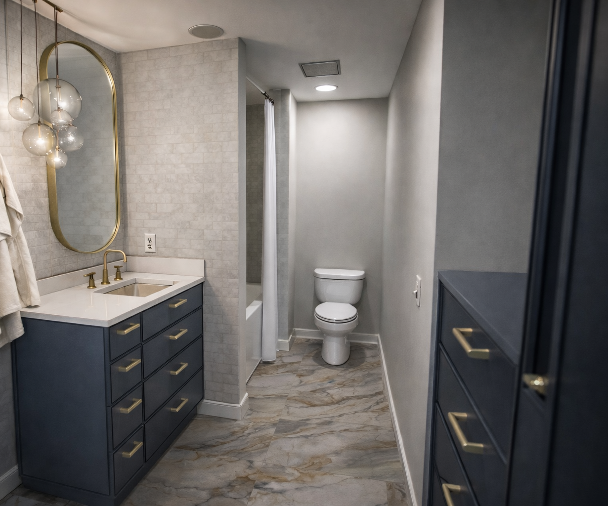 This client wanted to remodel both their Primary Bathroom, and Guest Bathrooms to keep in step with the other renovations they had completed in the home. We were able to give a polished, and contemporary update without moving any of the existing plumbing locations. We removed builder-grade closets, and in their place provided added value and storage with custom built-in storage.